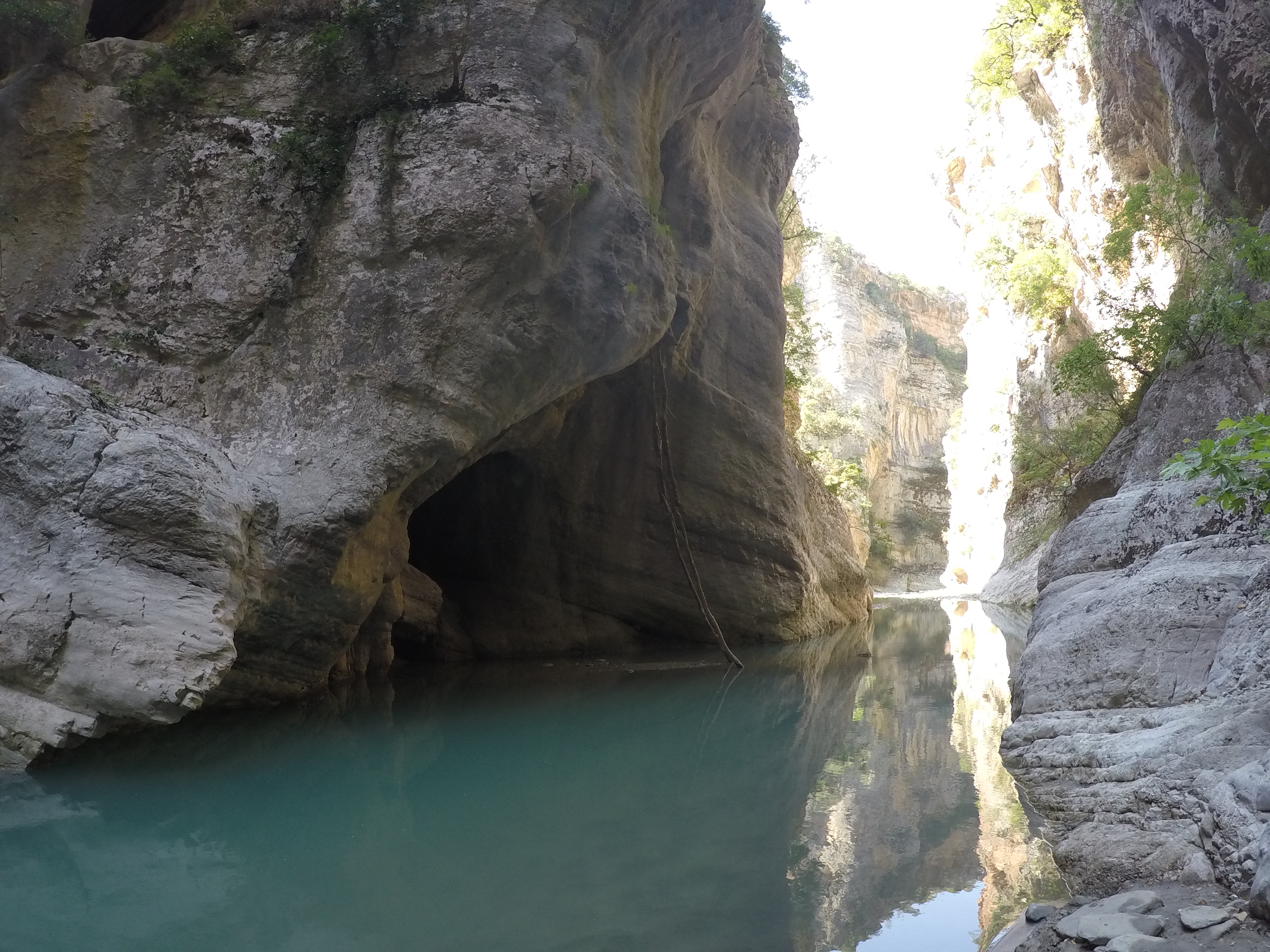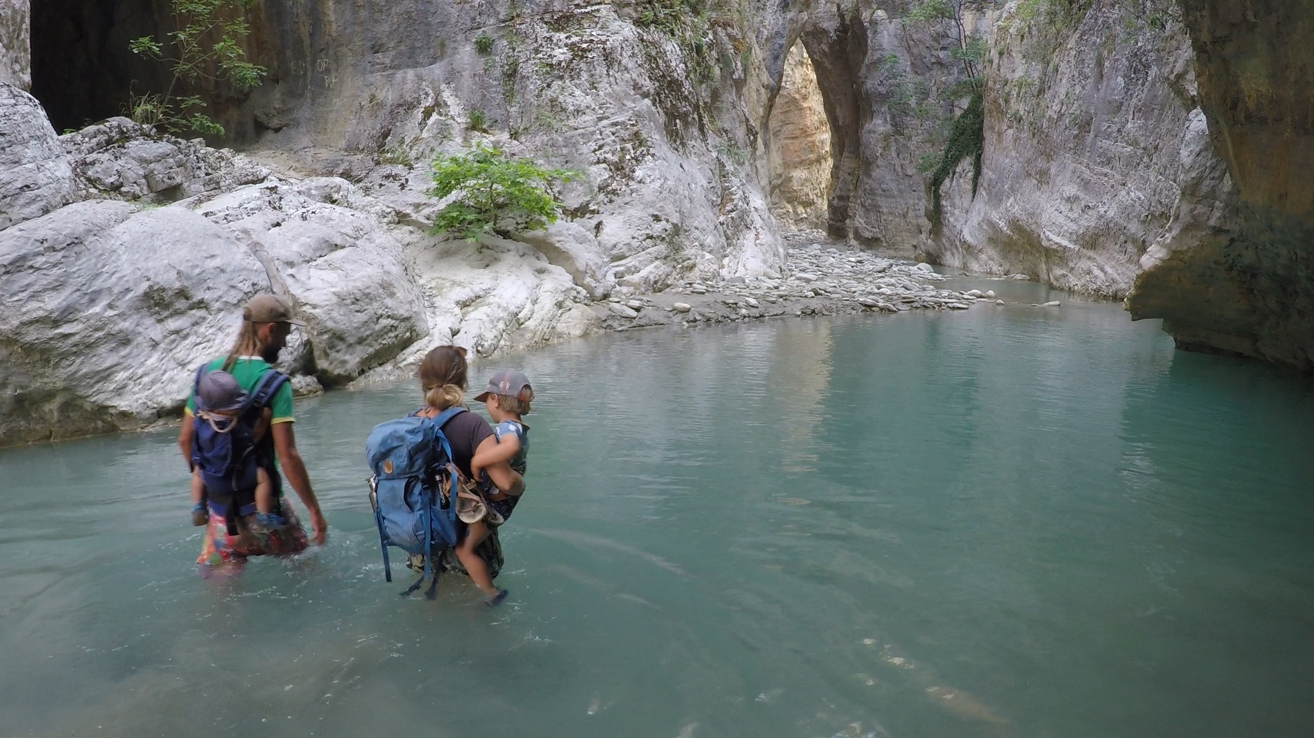 Zu entdecken gibt es außerdem kleine Höhlen, eine alte Steinbrücke ohne Geländer sowie den Canyon. Dieser bietet sich perfekt für abenteuerliche Wanderungen an. Wir haben also Yaro in die Trage gesetzt, unsere Wasserschuhe angezogen und sind los in die angenehm schattige Schlucht spaziert. Dazu mussten wir immerwieder den Fluss durchqueren und über Steine klettern. Die Kinder fanden unsere kleine Expedition richtig cool! Das ging aber auch nur so gut, weil Nael mittlerweile relativ erfahren mit wandern, klettern und Wasser ist.