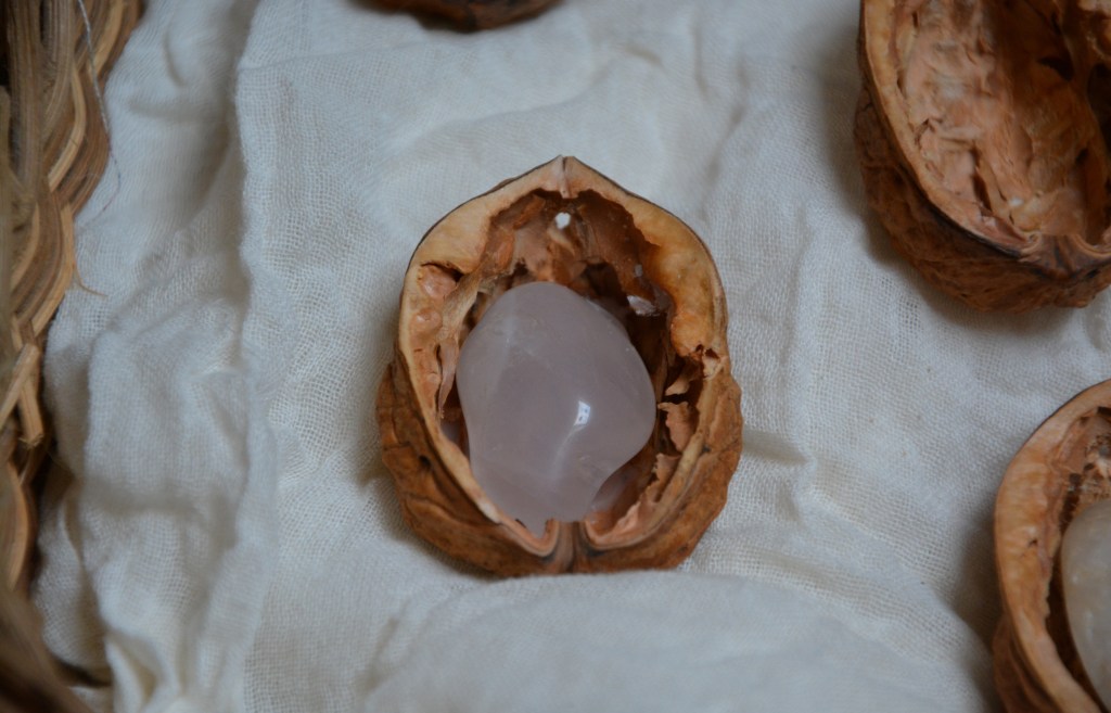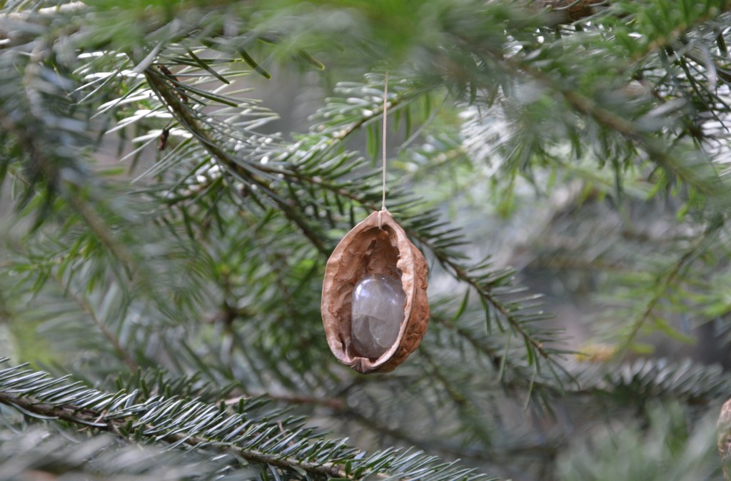 Bohre mit dem Handbohrer oder mit der Messerspitze ein kleines Loch oben in die Nussschale. Tropfe heißes Bienenwachs in die Nussschale und drücke einen Edelstein hinein. Du benötigst eine gewisse Menge davon, um den Stein so zu befestigen. Pass aber auf, dass Du sauber arbeitest und auch nicht zu viel Wachs verwendest, damit das Resultat am Ende auch schön aussieht! Theoretisch könntest Du auch eine Heißklebepistole dazu verwenden, Bienenwachs ist hier allerdings die nachhaltigere Wahl! Im Anschluss brauchst Du nurnoch zur Aufhängung einen Faden oben an der Nusschale fixieren.